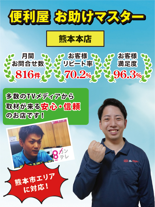この度は便利屋お助けマスター熊本本店にご来店いただきまして誠にありがとうございます。当社では「格安」を売りにしているわけでは無く、決して大手の便利屋さんでもありません。しかし、そんな中当社をお選びいただけたお客様には必ず「選んでよかった」 と言っていただけるサービスのご提供をお約束いたします。
